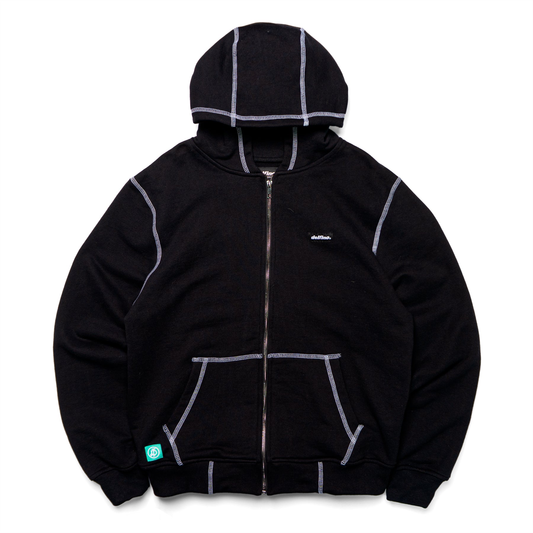 Sudadera de algodón con cortes tejidos de color en contraste. Cierre frontal metálico y bolsillos de parche. 100% algodón. Hecho en México.